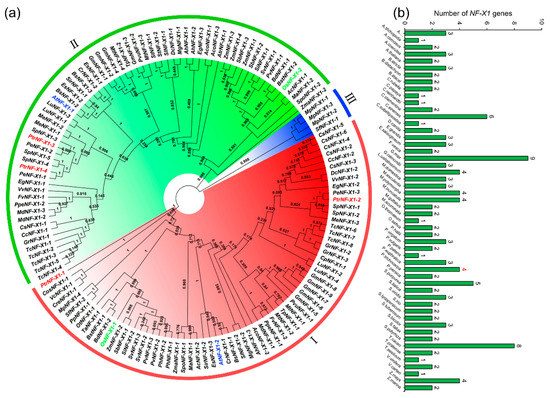 In order to better know the evolution and differentiation of NF-X1 family proteins among species, 138 NF-X1 amino acid sequences from 52 species were applied to construct an unrooted phylogenetic tree (Figure 1a). These sequences were divided into three groups (I, II, III). Among them, class I and II had the most members, including 134 members and accounting for 97.10% of the deduced NF-X1 protein. At the same time, NF-X1 proteins from A. thaliana, O. sativa, and P. trichocarpa were evenly distributed in I and II.