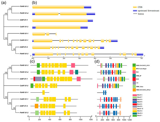 Phylogenetic, gene structure, conserved protein structure, and motif analyses of NF-X1 gene from A. thaliana, O. sativa, and P. trichocarpa. (a) Phylogenetic tree composed of total length amino acid sequences from NF-X1 proteins. (b) Exon–intron structure analysis of NF-X1 genes. Blue boxes represent UTR regions; yellow boxes indicate exons; black lines represent introns. (c) Conserved protein domain analysis of NF-X1 proteins. (d) Motif distribution of NF-X1 members. The length of each pattern is displayed proportionally.