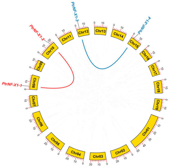 Schematic diagram of NF-X1 gene distribution and inter-chromosomal relationships in P. trichocarpa chromosomes. The gray lines represent all synteny blocks in the chromosome of P. trichocarpa. Red and blue lines show duplicated NF-X1 gene pairs in P. trichocarpa. The chromosome number is shown in the middle of the arc square. The length of each arc corresponds to the length of the chromosome (Mb).