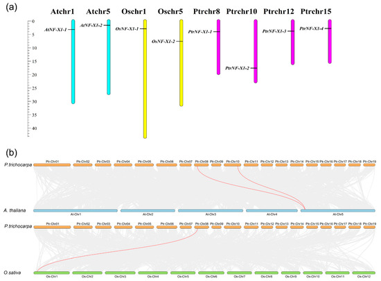 Synteny analysis of NF-X1 genes. (a) Locations of NF-X1 family genes on the chromosomes of A. thaliana, O. sativa, and P. trichocarpa. (b) Synteny analysis of NF-X1 genes between poplar and the other two model plants. Gray lines in the background represent the co-linear blocks in poplar and other model plant genomes, while the red lines emphasize the syntenic NF-X1 gene pairs.