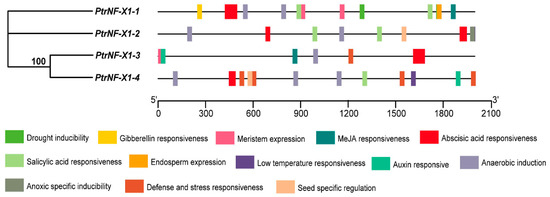 In addition, there were also some stress or stress-related elements in the promoter region, including MeJA responsiveness, salicylic acid responsiveness, abscisic acid responsiveness, drought inducibility, defense and stress responsiveness, anoxic specific inducibility element, low-temperature responsiveness, and anaerobic induction, which meant PtrNF-X1 might also respond to stress. For example, all PtrNF-X1 gene promoters contained at least two elements of abscisic acid (ABA) responsiveness (Table S8), indicating that most of the NF-X1 gene was involved in ABA signal transduction. In addition, PtrNF-X1-1 had multiple elements related to adversity, including two elements of MeJA-responsiveness, two elements of salicylic acid responsiveness, three elements of abscisic acid responsiveness, and two elements of drought-inducibility (Table S8), suggesting that PtrNF-X1-1 may respond to both biotic and abiotic stress.