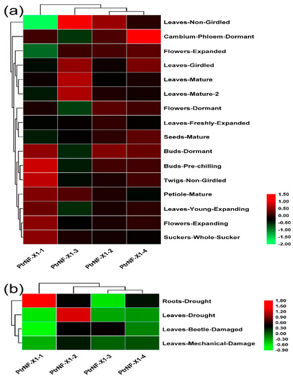 So as to explore the role of the NF-X1 gene in the growth and development of poplar, we analyzed the tissue expression patterns of four PtrNF-X1 genes in the transcriptomic dataset. First, we constructed a heat map of dual clustering (sample and gene) to reveal the expression profile of these genes in 15 tissues of poplar (Figure 6a and Table S9). Oddly enough, there is no good rule in the expression of four NF-X1 genes in different tissues and development of poplar. For example, through RNA-seq analysis, PtrNF-X1-1 was significantly upregulated in bud-pre-chilling and twigs-non-girdled, but significantly downregulated in leaves-non-girdled. At the same time, PtrNF-X1-3 was dramatically upregulated in leaves-non-girdled and leaves-mature, PtrNF-X1-2 was upregulated in leaves-non-girdled and bud-dormant, and PtrNF-X1-4 was significantly upregulated in cambium-phloem-dormant, compared with other tissues.
