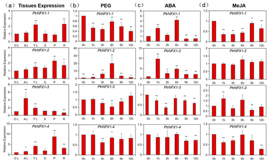 To deeply validate whether the abundance of NF-X1 genes were affected by abiotic stress and hormone treatment, four NF-X1 genes were carefully chosen for qRT-PCR assay to analyze their expression profiles in answer to PEG, ABA, and MeJA treatment (Figure 7b–d). In general, each treatment may significantly induce and inhibit NF-X1 genes in poplar. For PEG treatment, only PtrNF-X1-2 was significantly induced, while PtrNF-X1-1/3/4 was significantly inhibited. For ABA treatment, PtrNF-X1-2 was significantly induced, while PtrNF-X1-3/4 was significantly inhibited. Meanwhile, PtrNF-X1-1 was induced at 1 and 6 h, while inhibited at 9 and 12 h. Furthermore, for MeJA treatment, PtrNF-X1-1/4 was significantly inhibited, while PtrNF-X1-2 had no response. Simultaneously, PtrNF-X1-3 was significantly upregulated at 1 h MeJA treatment, but significantly inhibited at 9 h.