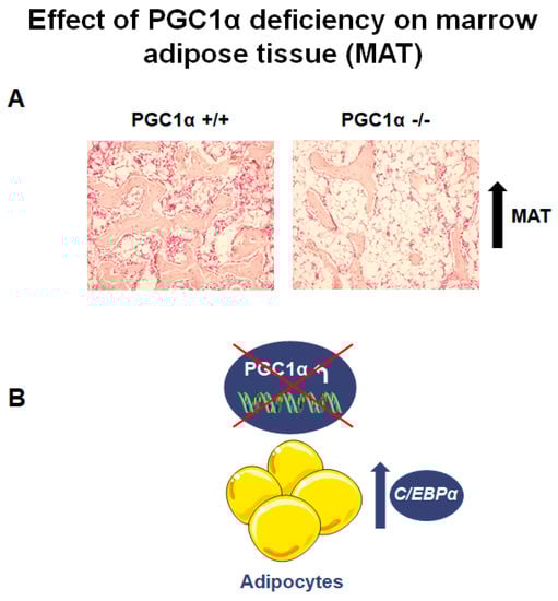Yu and colleagues, in 2018, investigated PGC1α role in the commitment of skeletal stem cells (SSCs) and thus its involvement in the balance between bone tissue and adipose tissue associated with osteoporosis []. SSCs are bone marrow stromal cells characterized by the ability to self-renew and to differentiate, if properly stimulated, towards both the osteoblastic and adipocytic cell lineage [,,]. In addition, several pieces of evidence, in both animal and human data, demonstrated an inverse association between MAT and bone density and strength []. In humans, MAT was negatively associated with bone mineral density (BMD) in healthy Caucasian women [] and in a group of healthy Caucasian and African-American men and women aged 38–52 []. In animals, in two mouse models of type 1 diabetes mellitus, the adipocyte markers, Peroxisome proliferator-activated receptor γ2 (PPARγ2), adipocyte Protein 2 (aP2) and Resistin (RETN) were upregulated in tibia, while Ocn mRNA and osteocalcin serum level decreased [,]. Yu and colleagues’ study showed that PGC1α deficiency increased bone loss and MAT accumulation, in skeletal tissue during aging [], supported by findings showing the increase of CCAAT/enhancer-binding protein alpha (C/EBPα), a key transcription factor involved in adipocyte differentiation [], by bone marrow precursors from PGC1α deficient mice (Figure 2A,B) [].