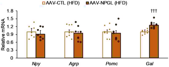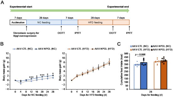 2.1. Effects of NPGL-Precursor Gene Overexpression on Food Intake and Body Mass Gain under NC and HFD Conditions