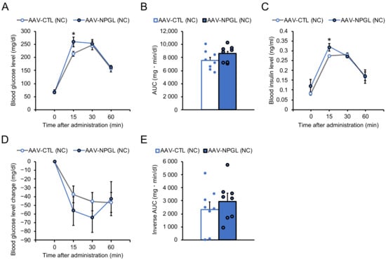 2.2. Effects of NPGL-Precursor Gene Overexpression on Glucose Homeostasis and Insulin Sensitivity under NC Conditions