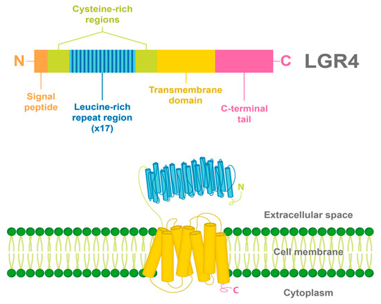 Similar to all LGRs, LGR4 has a large N-terminal extracellular domain that enables the binding of specific ligands. This extracellular domain is constituted by 17 leucine-rich repeats (LRR) flanked by N-/C- cysteine-rich regions. A common seven-transmembrane helix domain characteristic of all GPCRs is found in LGR4, having three extracellular and three intracellular loops, and a C-terminal intracellular domain [12,14] (Figure 1).