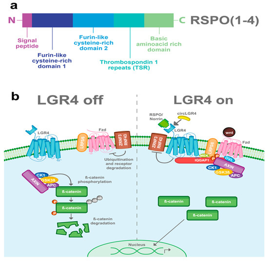 LGR4-induced Wnt/β-catenin signaling pathway. (a) RSPOs are a family of secreted proteins that can activate LGR4-induced Wnt/β-catenin signaling. Structurally, all the RSPOs have a signal peptide in the N-terminal domain, two furin-like cysteine-rich domains, a thrombospondin 1 repeat domain (TSR), and a basic amino acid-rich domain, which varies in size according to the RSPO member (b) In the absence of RSPO, ZNF3/RNF43 ubiquitinates the frizzled (Fzd)/LRP5-6 receptor complex for degradation. Wnt signal is blocked and the β-catenin destruction complex (formed by CK1, GSK3β, APC, and AXIN) is activated. GSK3β and CK1 phosphorylate β-catenin, inducing its ubiquitination and consequent proteasomal degradation. When LGR4 is activated by RSPOs, Norrin, or circLGR4 ligands, it stabilizes the frizzled/Lrp5-6 complex in the membrane, avoiding its degradation by inhibiting the activity of ZNRF3 and RNF43 proteins. Furthermore, LGR4 recruits IQGAP1 with an increasing affinity for DVL and recruits MEK, which phosphorylates LRP5/6, leading to the recruitment and inhibition of the β-catenin destruction complex into the Fzd/Lrp5-6 complex receptor.
