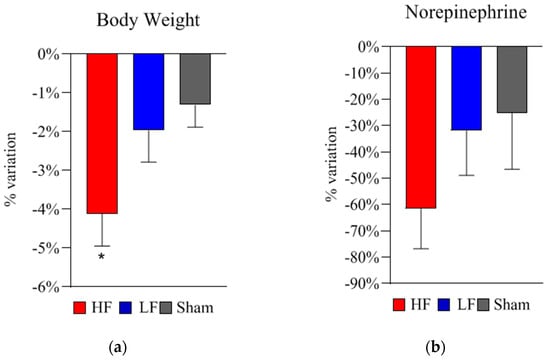 Deep TMS treatment effects on bodyweight and norepinephrine levels in the three groups. (a) Treatment effects on bodyweight. Bodyweight variation between baseline and following the 5-week treatment is shown for all groups (HF, high frequency 18 Hz; LF, low frequency 1 Hz; sham). The panel presents the average percent variations (mean% ± SEM) in bodyweight after the 5-week treatment (HF: −4.1 ± 0.8%, LF: −1.9 ± 0.8%, sham: −1.3 ± 0.6%, * p = 0.042). Analysis revealed a significant decrease in bodyweight in HF compared to the other two groups (* p = 0.042). (b) Treatment effects on norepinephrine. Norepinephrine variation between baseline and following the 5-week treatment is shown for all groups (HF, high frequency 18 Hz; LF, low frequency 1 Hz; sham). The panel presents the average percent variation (mean% ± SEM) in norepinephrine levels compared to baseline. Analysis revealed a significant decrease in norepinephrine in HF (−61.5 ± 15.2% vs. baseline, p = 0.007) and, although smaller, in LF (−31.8 ± 17.1% vs. baseline, p = 0.041). Comparing norepinephrine variation percentages between groups, no significant differences were found. Statistical analysis was performed using the two-tailed t-test. Legend: SEM = standard error of the mean; * p < 0.05.