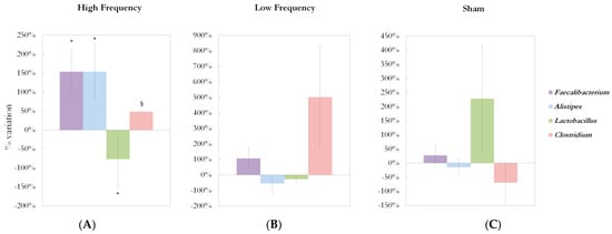 After 5 weeks of HF dTMS, a reduction of Bacteroidetes (about −22.6%) and a negligible increase in Firmicutes (about +0.8%) were observed. In the LF group, Bacteroidetes decreased of about −20.8%, and Firmicutes of about −10.1%. As regard to the sham group, a mild decrease in both Bacteroidetes (about −3.2%) and Firmicutes (about −6.5%) was observed. Variation at phylum level was statistically significant only in the LF group.