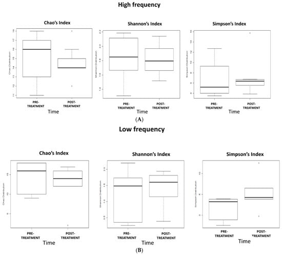 Shannon’s, Simpson’s, and Chao’s indices were calculated at T0 and T2 time-points to evaluate bacterial diversity and richness in the gut microbiota in the three groups (Figure 3A–C). No significant differences in gut microbiota biodiversity were observed after HF, LF dTMS, and sham treatment.