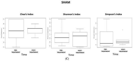 Effects of 5-week dTMS treatment on gut microbiota biodiversity evaluated by Chao’s, Shannon’s, and Simpson’s indices in the 3 treatment groups: (A) HF, (B) LF, (C) sham.