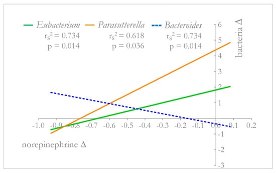 In the HF group, after 5 weeks of dTMS treatment, a significant correlation was found between the BMI variation and the increase in Phascolarctobacterium genus (r2 = 0.530; p = 0.026). Among neurohormonal parameters, norepinephrine decrease significantly correlated with several genera variations: Eubacterium (r2 = 0.734; p = 0.014), Bacteroides (r2 = 0.734; p = 0.014), and Parasutterella (r2 = 0.618; p = 0.036) (Figure 4). Details of the liner regression model have been shown in the Table S2 (Supplementary Material).