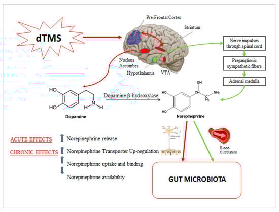 Possible mechanisms involved in the relationship between dTMS, rebalancing of the gut microbiota composition and norepinephrine variation. Deep TMS by stimulating the PFC at high frequency could acutely induce activation of the dopaminergic reward system (striatum, VTA, nucleus accumbens), promoting dopamine release. Norepinehrine mainly derives from dopamine manipulation by dopamine B-hydroxylase; norepinephrine could be locally released in the gut through postganglionic sympathetic nerve fibers. At the same time, dTMS could induce a HPA axis-mediated systemic response, promoting norepinephrine synthetization from chromaffin cells of the adrenal medulla; norepinephrine achieves the gut through the bloodstream. Chronic treatment with dTMS has been suggested to induce a NET modulation, with a consequent central decrease in norepinephrine outflow. We hypothesized that the decreased systemic norepinephrine results in a reduced gut luminal norepinephrine, with consequent beneficial effects on gut microbiota composition. Legend: dTMS = deep transcranial magnetic stimulation; PFC= prefrontal cortex; VTA= ventral tegmental area; HPA = hypothalamic-pituitary-adrenal; NET = norepinephrine transporter.