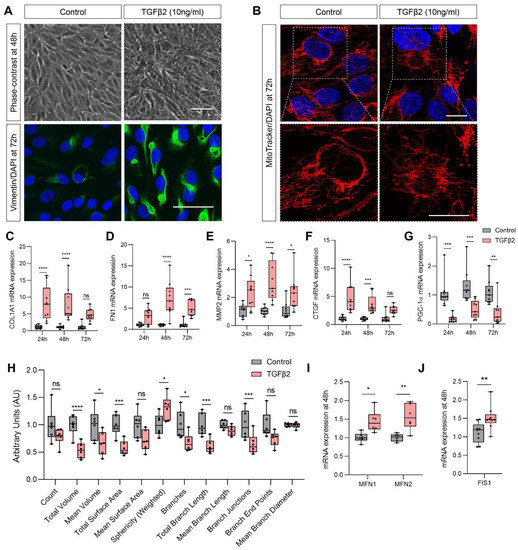 TGFβ2-induced epithelial-mesenchymal transition (EMT) is accompanied by mitochondrial dysfunction. ARPE-19 cells were treated with TGFβ2 for up to 72 h. (A) Representative phase-contrast images depicting cellular morphology at 48 h (n = 3, scale bar is 50 μm) and representative immunofluorescence images of the mesenchymal marker, vimentin (green) and DAPI (nuclei, blue) at 72 h (n = 3, scale bar is 50 μm). (B) Representative images showing mitochondrial morphology using confocal microscopy imaging of MitoTracker Orange (red) and DAPI (nuclei, blue) at 72 h (n = 3, scale bar is 20 μm) for control and TGFβ2-treated cells and corresponding magnified views of selected areas (scale bar is 20 μm). Quantification of mesenchymal genes (C) COL1A1, (D) FN1, (E) MMP2, (F) CTGF and (G) PGC-1α by qPCR at 24, 48 and 72 h with or without TGFβ2 treatment (n = 9, two-way ANOVA with Sidak’s post-hoc analysis). (H) Confocal images were analyzed by automated processing to quantify mitochondrial shape and network parameters (n = 6, unpaired t-test). Quantification of mitochondrial fusion gene expression following treatment with or without TGFβ2 at 48 h for fusion genes (I) MFN1 and MFN2 (n = 6, two-way ANOVA with Sidak’s post-hoc analysis) and the mitochondrial fission gene (J) FIS1 (n = 9, unpaired t-test). Error bars are means ± SEM. * p ≤ 0.05; ** p ≤ 0.01; *** p ≤ 0.001; **** p ≤ 0.0001; ns, not significant.