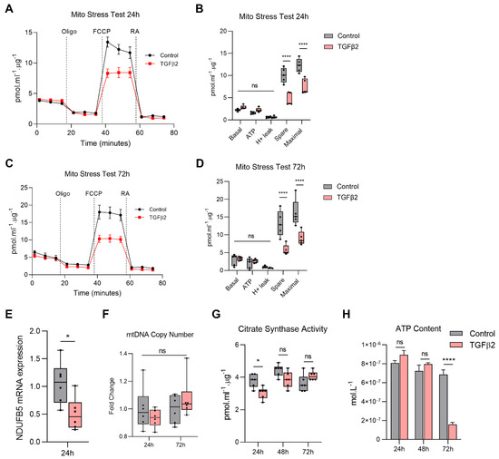 During OXPHOS, electrons from oxidative substrates generated in the tricarboxylic acid (TCA) cycle are transferred to oxygen through a series of redox reactions to form water. In this process, protons are pumped from the matrix across the mitochondrial inner membrane through respiratory complexes of the ETC that produce an electrochemical gradient to enable ATP generation. TGFβ2 significantly downregulated gene expression of NDUFB5 (a key component of Complex I) at 24 h (Figure 2E).