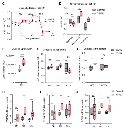 Given the reduction in mitochondrial respiration, we next asked whether there were any compensatory bioenergetic shifts in the glycolytic pathway. Real-time analysis of glycolytic function using the Seahorse XF24 BioAnalyzer measures changes in extracellular acidification rate (ECAR). While no significant differences in basal glycolysis were observed, TGFβ2 significantly upregulated glycolytic capacity and glycolytic reserve at 24 h (Figure 3A,B) and 72 h (Figure 3C,D). TGFβ2 increased glucose uptake (Figure 3E) and increased gene expression of transporters and enzymes critical to the glycolytic pathway. Specifically, TGFβ2 significantly upregulated gene expression of the glucose transporter GLUT3, but not GLUT1 or GLUT12 (Figure 3F). Cancer cells that show a preference for glycolysis have been observed to upregulate the expression of monocarboxylate transporters (MCTs) to serve as lactate shuttles [20]. The RPE is known to express two MCTs, MCT1 apically and MCT3 basolaterally [21]. We found that TGFβ2 significantly upregulated the gene expression of MCT1 but not MCT3 (Figure 3G). Additionally, we found that TGFβ2 also significantly increased the gene expression of three key glycolytic enzymes, specifically PFKFB3 (Figure 3H), PKM2 (Figure 3I) and LDHA (Figure 3J).