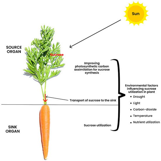 Sucrose also acts as the signaling molecule that coordinates roots (sink) and shoots (mainly source) development [4,5]. Alteration in the sucrose source–sink balance impedes plant growth and development [6]. Plant growth is greatly enhanced when the primary assimilates in the source tissues balance with the metabolic needs of the heterotrophic sinks. The translocation of photo-assimilate to the sink and its utilization at the sink level is mainly altered by environmental factors. However, little attention has been directed toward the influence of these environmental factors on photo-assimilate transport and utilization at the sink level. Thus, a conceptual understanding of the source–sink interaction is paramount for optimizing plant growth under fluctuating environmental conditions. To fully understand the interaction between the partitioning of photo-assimilates, plant growth, and environment (Figure 1), the following sections focus on: (1) strategies to improve the capacity and efficiency of photosynthetic C assimilation, (2) how changes in sucrose utilization when manipulating photosynthesis affect plant growth, (3) sucrose transport from the source to the sink organs, and (4) utilization of sucrose at the sink organs. We also summarized the impact of environmental cues on the translocation of sucrose to the sink and its utilization at the sink level. In addition, the strategic approaches involved in crop-yield improvement are discussed.