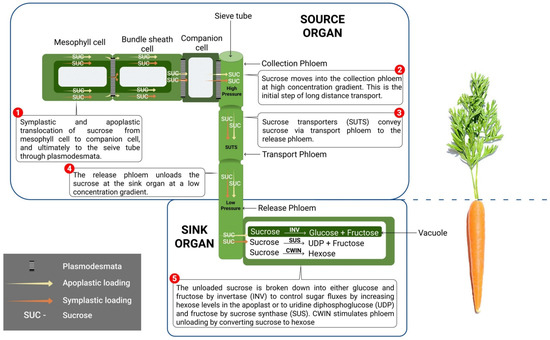 Plant growth and development are adversely affected when photo-assimilates are not appropriately apportioned. A balanced distribution and allocation of carbon (C) to various plant organs is crucial for plant growth, since the translocation of carbohydrates from the photosynthesizing “source” leaves provide substrates required for the growth of nonphotosynthesizing “sink” organs. During photosynthesis, carbon dioxide (CO2) can be efficiently converted into 3-phosphoglyceric acid and glyceraldehyde-3-phosphate, which act as a precursor for starch and sucrose biosynthesis. A portion of the plant photosynthates is stored in the form of starch within the chloroplast. At night, these stored reserves are remobilized as sucrose to support plant growth and metabolism [1,2]. Sucrose is the transportable form of carbon predominantly utilized at the sink to supply the energy required for plant biomass production [3].