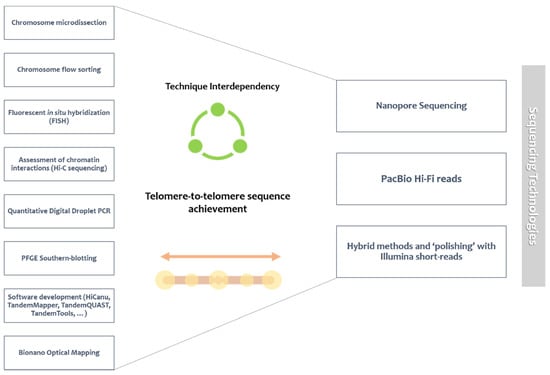 Telomere-to-telomere (T2T) assembly of human chromosomes relied on several different techniques. This combined approach was indispensable for closing the remaining gaps found in early assemblies (mostly related with telomeric, centromeric, and other interstitial regions like segmental duplications). The use of both PacBio and Nanopore sequencing, together with “polishing” methods, was applied as a sequencing strategy. The methodologies presented in the left allowed improve sequence mapping and assembly.
