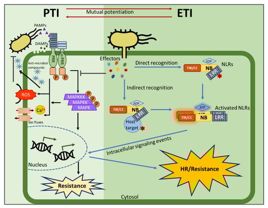 Schematic view of pattern-triggered immunity (PTI) and effector-triggered immunity (ETI) in plants. The first layer of induced immunity, called PTI (indicated by black arrows), is activated by the recognition of pathogen-associated molecular patterns (PAMPs) or damage-associated molecular patterns (DAMPs) through pattern recognition receptors (PRRs). Several PTI signaling events occur, such as activation of the mitogen-activated protein kinases (MAPK) kinase cascades, an influx of Ca2+ into the cytosol, and production of reactive oxygen species (ROS). Antimicrobial compounds are produced and the defense genes are activated. However, to suppress PTI, the pathogens deploy effectors. When they are recognized by nucleotide-binding (NB) and leucine-rich-repeat (LRR)-containing receptors (NLRs), the second immune layer, called ETI (indicated by blue arrows), takes place. NLRs directly or indirectly perceive pathogenic effectors, leading to a conformational change, which together with several intracellular signaling events, ultimately trigger the hypersensitive response (HR) or other defense responses. Surprisingly, the most recent studies reported that PTI and ETI are mutually linked and together potentiate the immune response (indicated by red arrows).