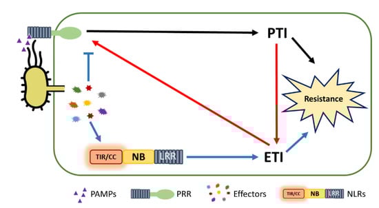Structural and functional analysis in current studies of many R proteins reveals that there are two conserved features, nucleotide-binding (NB) and leucine-rich repeat (LRR) domains, known as NLRs. The structure of other NLR domains depends on whether a Toll-interleukin 1-like receptor (TIR) or a coiled-coil (CC) is attached at the N terminus (Figure 1) [32,33]. Host plants employ a diverse family of NLRs to detect effectors rapidly during pathogen invasion. NLRs selectively recognize the effectors, either directly or indirectly, and such recognition often leads to a hypersensitive response, a form of rapid localized programmed cell death (Figure 1) [28,34,35]. The immune responses elicited by PRRs and NLRs are similar, although the duration and amplitude of ETI responses are often vastly larger than those of PTI responses (Figure 1) [30]. However, it was reported that there is a hefty overlap in the transcriptional regulation during PTI and ETI [36,37]. Surprisingly, the most recent studies reported that there is even a substantial linkage between NLR-mediated ETI and PRR-mediated PTI (Figure 1) [38,39].