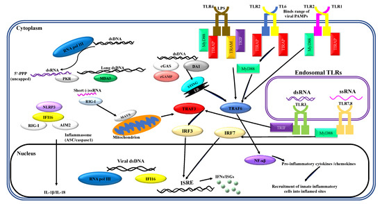 Neutrophils are the largest proportion of any cell subset within the innate immune system [1] and have traditionally been thoroughly characterized as an effective component of bacterial pathogen clearance. Research over the past decade has emphasized the expanding role of these innate cells in viral clearance [2,3,4]. Innate immune responses are initiated by recognition of PAMPs by a limited array of specific pattern recognition receptors (PRRs) expressed in and on sentinel cells. Recognition of viral PAMPs by PRRs—expressed by hematopoietic and non-hematopoietic cells of the immune system—results in the activation of intracellular signaling pathways, mediated by several interconnected adaptor proteins. Toll-like receptors (TLRs), which are an important class of PRRs, signal through a range of adaptor proteins. These virus-induced intracellular signaling pathways eventually converge on IFN regulatory factor (IRF)-mediated upregulation of IFNs and IFN-stimulated genes (ISGs) (Figure 1).
