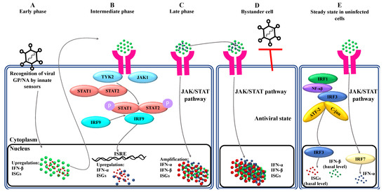 A triphasic (early, intermediate, and late) model of type I IFN responses was proposed from extensive murine studies [32,33,34] (Figure 2). As depicted earlier, viral recognition by innate cells of the immune system resulted in the induction of intracellular signaling pathways, culminating in upregulation of IFN-β and ISGs [35,36,37,38] (Figure 2A). Autocrine feedback of IFN-β with IFNAR on virus-infected cells mediated the intermediate phase of the response, beginning with the activation of the Janus kinase/signal transducer and activator of transcription (JAK/STAT) signaling pathway, leading to formation of an IFN-stimulated gene factor 3 (ISGF3) transcription factor complex, whose complex was composed of phosphorylated STAT1/STAT2 and IRF9. Binding of ISGF3 to IFN-stimulated response elements in the promoter region of ISGs upregulated numerous IFN target genes, including interferon regulatory factor 7 (IRF7). Like IRF3, activated cytoplasmic IRF7 translocated to the nucleus to induce the induction of IFN-α genes [39,40,41,42] (Figure 2B). The late phase of the IFN response was mediated by a positive feedback loop, through which IRF7 and IRF3 cooperated to induce robust induction of IFN-α and -β genes, respectively. This, in turn, led to the induction of numerous ISGs mediating type I IFN-driven antiviral responses [27,41,43,44,45,46,47] (Figure 2C). Amplification of IFN α/β genes in the late phase of the type I IFN response was associated with boosted pro-inflammatory responses, resulting in increased infiltration of type I IFN-producing-effector cells and thereby further amplification of inflammatory responses. Ultimately, type I IFNs not only promoted apoptosis of virus-infected cells but also prevented virus spread into uninfected neighboring cells (via paracrine interaction with IFNAR on the surface of those cells), decreased protein translation and synthesis, induced MHC class I and II expression, and degraded RNA [42,44] (Figure 2D). While IRF3 is essential for both early and late phases of the IFN response, IRF7 is a critical component of the positive feedback loop during the late stage of the IFN response. Unlike IRF3, which is constitutively expressed in uninfected cells, IRF7 is a transient, short-lived protein that is produced and phosphorylated in response to IFN-α/-β signaling within virus-infected cells [45].