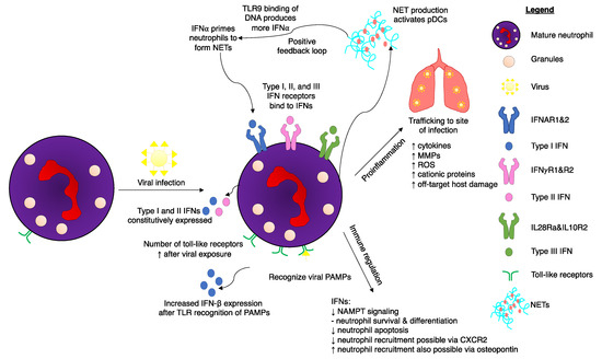 Interferon (IFN)-mediated regulation of neutrophils upon viral infection of a host. Viral infections induce many changes to neutrophil biology. Toll-like receptor (TLR) expression increases after viral exposure, resulting in increased production of type I interferons (IFNs). Neutrophils possess receptors for all three interferon subsets. A positive feedback loop occurs during the production of neutrophil extracellular traps (NETs). IFNα results in NET production, which in turn activates plasmacytoid dendritic cells (pDCs). Binding of deoxyribonucleic acid (DNA) from the NETs to TLR9 produces more IFNα, which, in turn, can result in excessive NET production. IFN pathways result in both a proinflammatory response and immunoregulation. Although neutrophils are integral for hosts to successfully eliminate viral infections, certain viruses have adapted mechanisms to hijack the IFN response to cause unwanted neutrophil-induced host damage. Excessive production of cytokines can lead to fatal immune-mediated overreactions to the viral threat. Other abbreviations: CXCR2: CXC chemokine receptor 2, MMP: matrix metalloproteases, NAMPT: nicotinamide phosphoribosyltransferase, ROS: reactive oxygen species.