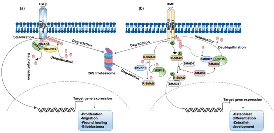 - Zhang, J.; Zhang, X.; Xie, F.; Zhang, Z.; van Dam, H.; Zhang, L.; Zhou, F. The regulation of TGF-beta/SMAD signaling by protein deubiquitination. Protein Cell. 2014, 5, 503–517. [Google Scholar] [CrossRef] [PubMed]