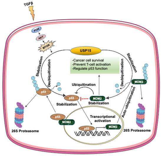 | p53 | Binding and stabilization of p53 | TGF-β signaling-mediated stabilization of p53 through increased USP15 translation that suppresses the early stages of cancer progression | [84] | |
