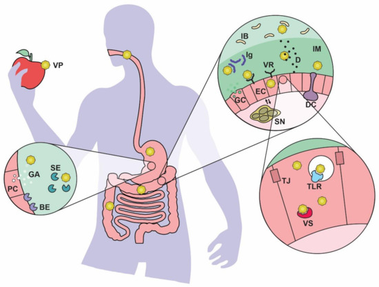 Upon oral ingestion of a virus, there are initial clearance mechanisms that are not specific to the host. Saliva and enzymes in the mouth, as well as mucus and cilia in the esophagus are designed to clear and/or inactivate microbial threats. As shown in Figure 1, the stomach’s low pH, additional digestive enzymes and bile salts are other barriers that viruses encounter as they navigate the gastrointestinal tract [24]. These chemical weapons do not affect all viruses the same; while enveloped viruses are known to be inactivated by bile salts, nonenveloped viruses can resist them [23]. Gastric and intestinal proteases, on the other hand, can increase the infectivity of some viruses, as has been shown for the Reoviridae family [26].