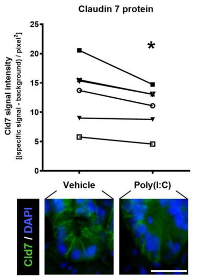 Claudin 7 protein in the ileal mucosa upon treatment with a TLR3 agonist. Rat ilea were treated ex vivo for 2 h with either vehicle (saline) or the TLR3 agonist, Poly(I:C) (200 μg/mL). Claudin 7 (Cld7), a component of tight junctions but also relevant for cell adhesion, was analyzed by immunofluorescence. In the graph, each line represents one rat (total n = 6) and connects the value obtained in the vehicle-treated portion of ileum with the value obtained in the corresponding Poly(I:C)-treated tissue. There was a loss of specific (lateral) signal in every case. Bar = 25 μm, * p < 0.05 by paired t test. Original data from Loreto Olavarría-Ramírez.