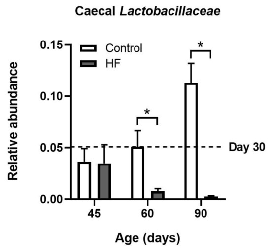 Relative abundance of Lactobacillaceae family in the caecal contents of rats under high fat (HF) diet. Rats received a diet containing 62% calories from fat from postnatal day 30 onwards. Age-matched controls were fed regular chow containing only 14% calories from fat. Bacterial DNA isolated from caecal contents was subjected to sequencing directed against the V3-V4 region of 16S rRNA gene, using an Illumina MiSeq platform. * p < 0.05 by PERMANOVA, n = 5. Original data from Alejandra Lopez-Aguilera and Johana Eyzaguirre-Velásquez.