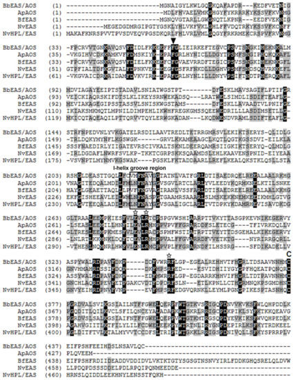 The multiple alignment of the CYP440A18 sequence with sequences of metazoan CYP74 clan members characterized earlier: Ap, Acropora palmata (coral); ApAOS, ACD42778.1; Bf, Branchiostoma floridae; BfEAS, ACD88492.1; Nv, Nematostella vectensis; NvEAS, XP_001636360.1; NvHPL/EAS, QJI54761.1. Conservative structures are marked as follows: the I-helix groove region is signed, while the F/L toggle, the ERR-triad, and the cysteinyl ligand are marked by triangle, stars, and C, respectively.