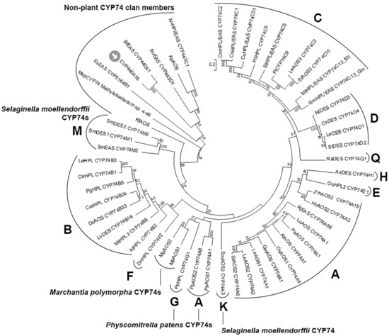 The unrooted phylogenetic tree of the CYP74 family. Classified CYP74 subfamilies are marked with their letter designations (A–H, K, M, and Q). The CYP440A18 enzyme is marked by an arrow. The following CYP74 clan members were used for analysis: Ap, Acropora palmata; ApAOS, ACD42778.1; As, Allium sativum; AsDES (CYP74H1), CAI30435.1; At, Arabidopsis thaliana; AtAOS (CYP74A1), NP199079.1; AtHPL (CYP74B2), C74B2ARATH; Bb, Branchiostoma belcheri; BbEAS/AOS, XP_019641998.1; Bf, Branchiostoma floridae; BfEAS (CYP440A1), ACD88492.1; Ca, Capsicum annuum; CaHPL (CYP74B1), NP001311810.1; CaDES (CYP74D4), NP001311513.1; Cas, Camellia sinensis; CasHPL (CYP74B24), BAU24783.1; Cs, Cucumis sativus; CsHPL/EAS/AOS (CYP74C31), XP004137005.1; CsHPL/EAS (CYP74C1_Cs), NP001274399.1; Cm, Cucumis melo; CmHPL/EAS (CYP74C2), NP001284390.1; Dc, Daucus carota; DcAOS (CYP74B33), XP_017248700.1; Es, Ectocarpus siliculosus; EsEAS (CYP5164B1), APG42673.1; Gm, Glycine max; GmAOS (CYP74A1), NP001236432.1; GmHPL/EAS (CYP74C13_Gm), KRH29541.1; Hv, Hordeum vulgare, HvAOS2 (CYP74A3), CAB86384.1; Kf, Klebsormidium flaccidum; KfAOS, BAS32649.1; Le, Solanum lycopersicum; LeAOS1 (CYP74A1), CAB88032.1; LeAOS2 (CYP74A2), AAF67141.1; LeAOS3 (CYP74C3), NP001265949.1; LeHPL (CYP74B3), AAF67142.1; LeDES (CYP74D1), NP001234527.1; Lu, Linum usitatissimum; LuAOS (CYP74A1), P48417.1; LuDES (CYP74B16), ADP03054.2; Mp, Marchantia polymorpha; MpAOS1, BAS32647.1; MpAOS2, BAS32648.1; Msp, Methylobacterium sp. 4-46, WP012335549.1; Mt, Medicago truncatula; MtHPL/EAS (CYP74C13_Mt), XP003606860.1; MtHPL3 (CYP74B4), AAY30368.1; Nt, Nicotiana tabacum; NtDES (CYP74D3), NP001312606.1; Nv, Nematostella vectensis; NvHPl/EAS (CYP443C1); NvEAS (CYP443D1), XP_001636360.1; Os, Oryza sativa; OsAOS1 (CYP74A4), XP015631686.1; OsHPL2 (CYP74E1), EAY85033.1; Pa, Parthenium argentatum; PaAOS (CYP74A1), sp|Q40778.2; Pd, Prunus dulcis; PdHPL (CYP74C5), CAE18065.1; Pg, Psidium guajava; PgHPL (CYP74B5), AAK15070.1; Pi, Petunia inflata; PiCYP74C9, ABC75838.1; Pp, P. patens; PpAOS1 (CYP74A1), XP024380613.1; PpAOS2 (CYP74A8), XP024372097.1; PpHPL (CYP74G1), CAC86920.2; Ra, Ranunculus acris; RaDES (CYP74Q1), AJU57209.1; Rj, Ranunculus japonicus; RjEAS (CYP74A88), QCR70269.1; Sm, Selaginella moellendorffii; SmDES1 (CYP74M1), XP002979266.1; SmDES2 (CYP74M3), XP002964012.2; SmEAS (CYP74M2), EFJ26024.1; St, Solanum tuberosum; StAOS2 (CYP74A6), ABD15175.1; StAOS3 (CYP74C10), CAI30876.1; StHPL/EAS (CYP74C4), XP006365486.1; StDES (CYP74D2), NP001305517.1; Zm, Zea mays; ZmAOS1 (CYP74A19), AAR33048.1; ZmHPL (CYP74F2), NP_001105255.2.