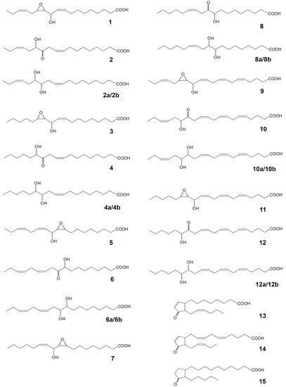 The structural formulae of products of recombinant CYP440A18 enzyme incubations with different substrates: 1, 11-hydroxy-12,13-epoxy-9,15-octadecadienoic acid; 2, (9Z,15Z)-12-oxo-13-hydroxy-9,15-octadecadienoic acid (α-ketol); 2a/2b, threo/erythro 12,13-diols (12,13-dihydroxy-9,15-octadecadienoic acid); 3, 11-hydroxy-12,13-epoxy-9-octadecenoic acid; 4, (9Z)-12-oxo-13-hydroxy-9-octadecenoic acid (α-ketol); 4a/4b, threo/erythro 12,13-diols (12,13-dihydroxy-9-octadecenoic acid); 5, 9,10-epoxy-11-hydroxy-12,15-octadecadienoic acid; 6, (12Z,15Z)-9-hydroxy-10-oxo-12,15-octadecadienoic acid (α-ketol); 6a/6b, threo/erythro 9,10-diols (9,10-dihydroxy-12,15-octadecadienoic acid); 7, 9,10-epoxy-11-hydroxy-12-octadecenoic acid; 8, (12Z)-9-hydroxy-10-oxo-12-octadecenoic acid (α-ketol); 8a/8b, threo/erythro 9,10-diols (9,10-dihydroxy-12-octadecenoic acid); 9, 13-hydroxy-14,15-epoxy-5,8,11,17-eicosatetraenoic acid; 10, 14-oxo-15-hydroxy-5,8,11,17-eicosatetraenoic acid (α-ketol); 10a/10b, threo/erythro 14,15-diols (14,15-dihydroxy-5,8,11,17-eicosatetraenoic acid); 11, 13-hydroxy-14,15-epoxy-5,8,11-eicosatrienoic acid; 12, 14-oxo-15-hydroxy-5,8,11-eicosatrienoic acid (α-ketol); 12a/12b, threo/erythro 14,15-diols (14,15-dihydroxy-5,8,11-eicosatrienoic acid); 13, cis-12-oxo-10,15-phytodienoic acid; 14, dihomo-cis-12-oxo-3,6,10,15-phytodienoic acid; 15, dihomo-12-oxophytonoic acid.