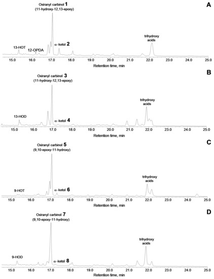 The total ion current GC–MS chromatograms of products (Me/TMS) of incubation of 13-HPOT (A), 13-HPOD (B), 9-HPOT (C), and 9-HPOD (D) with recombinant CYP440A18 enzyme. Conditions of incubation, extraction, derivatization, and analysis are described in the Materials and Methods section. The structural formulae of products are present at the Figure 4. 13-HOT, (9Z,11E,13S,15Z)-13-hydroxy-9,11,15-octadecatrienoic acid; 13-HOD, (9Z,11E,13S)-13-hydroxy-9,11-octadecadienoic acid; 9-HOT, (9S,10E,12Z,15Z)-9-hydroxy-10,12,15-octadecatrienoic acid; 9-HOD, (9S,10E,12Z)-9-hydroxy-10,12-octadecadienoic acid.