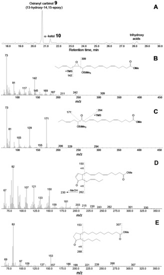 The main product of 13(S)-HPOT conversion by the CYP440A18 enzyme was compound 1, the mass spectrum of which (Me/TMS, Supplementary Materials Figure S1A) possessed M+ at m/z 396 (0.1%), [M–Me]+ at m/z 381 (0.5%), [M–pentenyl]+ at m/z 327 (1%), [M–C12/C18]+ at m/z 285 (57%), m/z 155 (18%), m/z 129 (40%), and [TMS]+ at m/z 73 (100%) (Figure 5A).