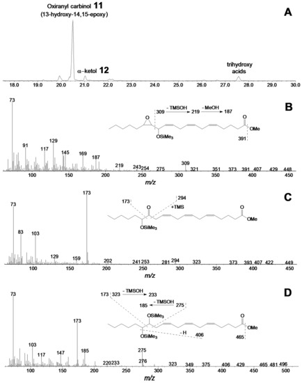 The mass spectrum corresponded to that of 13-hydroxy-14,15-epoxy-8,11,17-eicosatrienoic acid (Me/TMS). Catalytic hydrogenation of compound 11 over PtO2 followed by methylation and trimethylsilylation afforded saturated analogue 13-hydroxy-14,15-epoxy-eicosanoic acid (Me/TMS), described above. Thus, the mass-spectral data confirmed the identification of product 11 as oxiranyl carbinol 13-hydroxy-14,15-epoxy-5,8,11-eicosatrienoic acid (Me/TMS). The minor product of this reaction was the α-ketol 12 (Figure 7C)—14-oxo-15-hydroxy-5,8,11-eicosatrienoic acid (Me/TMS), which upon NaBH4 reduction was transformed to the diastereomeric pair (threo and erythro) of 14,15-diol (14,15-dihydroxy-5,8,11-eicosatrienoic acid, Me/TMS) 12a and 12b (Figure 7D), having identical mass spectral patterns: M+ at m/z 496 (0.4%), [M–Me]+ at m/z 481 (0.3%), [M–MeO]+ at m/z 465 (0.4%), [M–TMSOH]+ at m/z 406 (0.5%), [M–C15/C20]+ at m/z 323 (1.4%), [M–C14/C20]+ at m/z 275 (20%), [323–TMSOH]+ at m/z 233 (3%), [275–TMSOH]+ at m/z 185 (20%), [M–C1/C14]+ at m/z 173 (61%), and [TMS]+ at m/z 73 (100%).