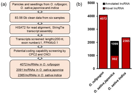 Identification of lncRNAs from wild and cultivated rice. (a) Pipeline used to identify lncRNA transcripts in this study. (b) Comparison of lncRNAs identified in this study from previously annotated rice lncRNAs. The red box represents the number of novel lncRNAs identified in this study, and the black box indicates the number of previously annotated lncRNAs in the literature [,] that are included in our datasets.
