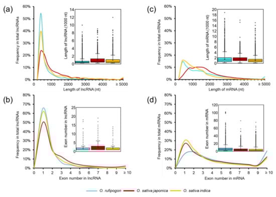 Frequency distribution comparisons of lncRNAs and mRNAs between wild and cultivated rice. (a) The length of lncRNAs. (b) The exon number of lncRNAs. (c) The length of mRNAs. (d) The exon number of mRNAs.