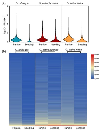 It is reported that a large number of lncRNAs are specifically expressed and involved in the sexual reproduction of rice. We next investigated the expression of lncRNAs in wild and cultivated rice. The results showed that lncRNAs were significantly higher expressed in panicles than in seedlings all through the three Oryza genomes. Statistical analysis suggested that the median log10(FPKM+1) value was 0.52 in panicles versus 0.06 in seedlings in wild rice (p < 0.0001), while the median values were 0.62 in panicles versus 0.44 in seedlings in japonica rice (p < 0.0001) and 0.66 in panicles versus 0.26 in seedlings in indica rice (p < 0.0001) (Figure 3a). A heatmap based on the value of log10(FPKM+1) was also generated to depict the difference in expression level among samples in each lncRNA, from which we could more clearly understand the generally higher expression of lncRNAs in panicles than in seedlings (Figure 3b). Among the 8528 lncRNAs identified in this study, we found a large proportion of lncRNAs were differentially expressed in panicles and seedlings (fold change > 2, and FDR < 0.05) (Supplementary Tables S1–S3), including 3040 out of 4072 lncRNAs (74.66%) in wild rice, 1104 out of 2091 lncRNAs (52.80%) in japonica rice, and 1659 out of 2365 lncRNAs (70.15%) in indica rice. To confirm the reliability of our datasets for lncRNA expression profiles, we experimentally validated the expression of twelve lncRNAs from wild and cultivated rice with different expression patterns. The results of qPCR analysis revealed that the expression of lncRNAs were consistent with those obtained from lncRNA sequencing (Supplementary Figure S2).