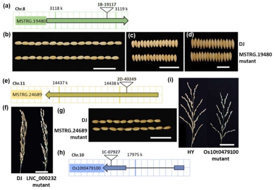LncRNAs have been identified to be important in plant reproductive development and stress responses [,]. To investigate whether the conserved rice lncRNAs during domestication would contribute to agronomic traits, we collected mutants of several conserved lncRNAs to detect their phenotypes. We retrieved the worldwide main rice mutant databases, including Rice Mutant Database [] and POSTECH [], and identified three rice mutant lines with T-DNA insertion mutations in three conserved lncRNAs MSTRG.19480, MSTRG.24689 and Os10t0479100 (Figure 5a,e,h). After the screening of homozygous lines of these mutants, we investigated the agronomic traits such as plant architecture, grain morphology, and resistance to Xanthomonas oryzae pv. Oryzae (Xoo) and Xanthomonas oryzae pv. oryzicola (Xoc) pathogens. The results showed that the yield-related traits like panicle architecture, seed-setting rate, grain weight, and size, as well as the performance of these mutants in bacterial resistance, were significantly affected by the expression of conserved lncRNAs in domestication (Figure 5, Table 2 and Supplementary Figure S3).