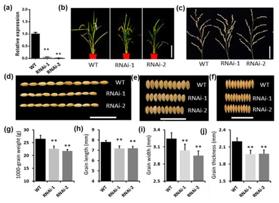 Phenotype analysis of RNAi lines of MSTRG.19480. (a) Expression level of MSTRG.19480 in RNAi lines. (b–f) Phenotype of MSTRG.19480 RNAi lines and wild-type (WT) plants, plant height (scale bar = 20 cm) (b), panicles (scale bar = 5 cm) (c), grain length (scale bar = 1 cm) (d), grain width (scale bar = 1 cm) (e), grain thickness (scale bar = 1 cm) (f). (g–j) Statistical analysis of grain weight (g), grain length (h), grain width (i) and grain thickness (j) in MSTRG.19480 RNAi lines and WT. Asterisks indicate statistically significant differences compared with WT by Student’s t test (** p < 0.01; n = 50).