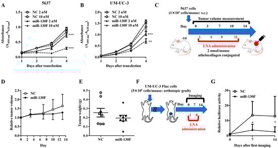An orthotopic animal model was established using a previously described technique []. Briefly, female mice were anesthetized with 1–2% isoflurane (Pfizer, New York, NY, USA). To prevent infection, the urethral tip was cleaned with 70% ethanol (Wako), and a 24-gauge Terumo catheter (Terumo) was inserted through the urethra into the bladder. The bladder was washed three times with 100 µL of phosphate-buffered saline (PBS; Thermo Fisher Scientific). Then, 100 µL of 0.25% trypsin (Life Technologies)/0.05% EDTA (Dojindo) at 37 °C was infused into the bladder under anesthesia, with each infusion retained for 5 min using a 30-g pressure clip (Natsume Seisakusho Co., Ltd., Tokyo, Japan, AM-1 30 g) on the urethra. The trypsin solution was then drained, and the bladder was washed twice with PBS (100 µL). Finally, 50 µL of DMEM containing 5 × 106 UM-UC-3 Fluc cells was infused into the bladder and was retained for 2 h using a 30-g pressure clip under anesthesia. The clip was then removed, and the urethral meatus was disinfected with povidone-iodine. Cisplatin was intravenously injected into mice (10 mg/kg; PBS group, n = 5; cisplatin group, n = 5). LNA coated with AteloGene® Local Use “Quick Gelation” (4 nmol/mouse) was injected by transurethral injection (negative control LNA group: N = 5, miR-130F LNA group: N = 5). Upon in vivo imaging, VivoGlo In Vivo Imaging Substrates (Promega) dissolved in PBS (10 mg/mL) were intraperitoneally injected. Then, the image was captured using NightOWL (Berthold Technologies; Calmbacher, Germany).
