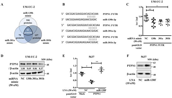 The miR-130 family target PTPN1 in bladder cancer. (A) SILAC-based proteome analysis was conducted using negative control, miR-301a, miR-301b, or miR-130b mimic-transfected UM-UC-2 cells. A total of 41 proteins were shared among the three members of the miR-130 family. (B) Predicted miR-130 family binding sequences within the 3′-UTR of human PTPN1 gene. The number indicates the nucleotide position of the predicted miR-130 family binding site from the start of the PTPN1 3′-UTR. (C) A dual-luciferase reporter assay was performed in UM-UC-2 cells transfected with negative control (NC) or miR-130 family mimics. Data are presented as the mean ± SD of five independent experiments. Data were analyzed using one-way ANOVA with Bonferroni post-hoc tests * p < 0.05; ** p < 0.01. Data are presented as the mean ± SD (n = 9). (D) UM-UC-2 cells were transfected with miR-130 family mimics. Protein expression levels of PTPN1 and β-actin were evaluated by Western blot analysis. Representative pictures of three independent experiments are shown. The numbers in the figure indicate the expression ratio of PTPN1 and actin analyzed by the densitometer. Uncropped Western blot data are shown in Supplementary Figure S6. (E) A dual-luciferase reporter assay was performed in 5637 cells transfected with negative control (NC) or miR-130F. Data were analyzed using one-way ANOVA with Bonferroni post-hoc tests * p < 0.05; ** p < 0.01. Data are presented as the mean ± SD (n = 3). (F) 5637 cells were transfected with miR-130F. Protein expression levels of PTPN1 and β-actin were evaluated by Western blot analysis. Representative pictures of three independent experiments are shown. Uncropped Western blot data are shown in Supplementary Figure S6.