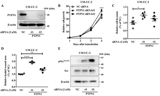 PTPN1 function as a tumor suppressor in bladder cancer cells. PTPN1 functions as a tumor suppressor in bladder cancer cells. UM-UC-2 cells were transfected with negative control siRNA (NC) or PTPN1 siRNAs. (A) Protein expression levels of PTPN1 and β-actin were evaluated by Western blot analysis. Representative pictures of three independent experiments are shown. Uncropped Western blot data are shown in Supplementary Figure S6. The effects of PTPN1 siRNAs on the growth (B), invasion (C), and migration (D) of UM-UC-2 cells were examined. Data are presented as the mean ± SD (Figure 4B: n = 3, Figure 4C: n = 5, Figure 4D: n = 4). Data were analyzed using one-way ANOVA with Bonferroni post-hoc tests * p < 0.05; ** p < 0.01; *** p < 0.001; **** p < 0.0001. (E) Western blot analyses of pSrcTyr416, Src, and β-actin were performed using PTPN1 siRNA-transfected UM-UC-2 cells. Representative pictures of three independent experiments are shown. Uncropped Western blot data are shown in Supplementary Figure S6.