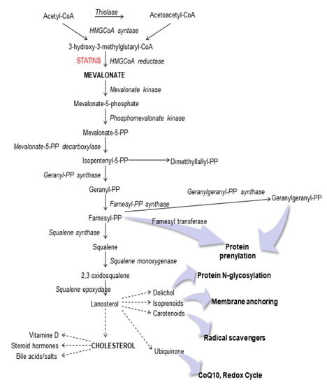 These dysregulations are more easily detectable in the central nervous system, since this area represents a system closed to cholesterol synthesis []. It is well known that statins, such as lovastatin, are able to induce apoptosis in neuronal cell lines and that the mevalonate prevents the programmed cell death induced by the blockade of this pathway [,].