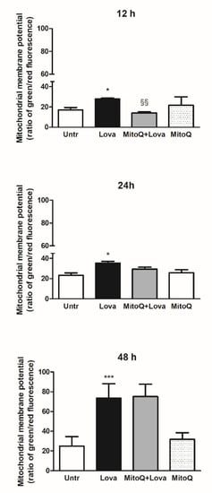 JC-1, a lipophilic cation dye, staining to evidence the mitochondrial membrane potential (N = 4 independent experiments). Data are shown as means ± SD (Lova vs. Untreated: * p < 0.05; *** p < 0.001; MitoQ + Lova vs. Lova: §§ p < 0.01 based on one-way ANOVA, post-test Bonferroni). Abbreviations: Untr, untreated; Lova, lovastatin.
